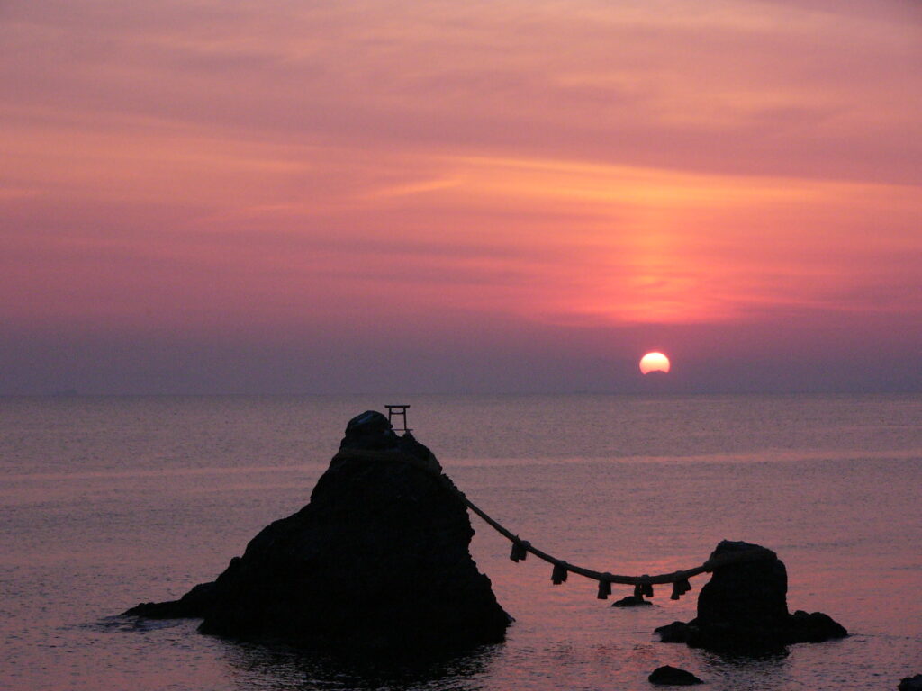 伊勢参拝の前に、古来より「浜参宮(清め)」の地として知られる二見興玉神社。そのシンボルである「夫婦岩」の間から昇る朝日は、言葉を失うほどの美しさです。